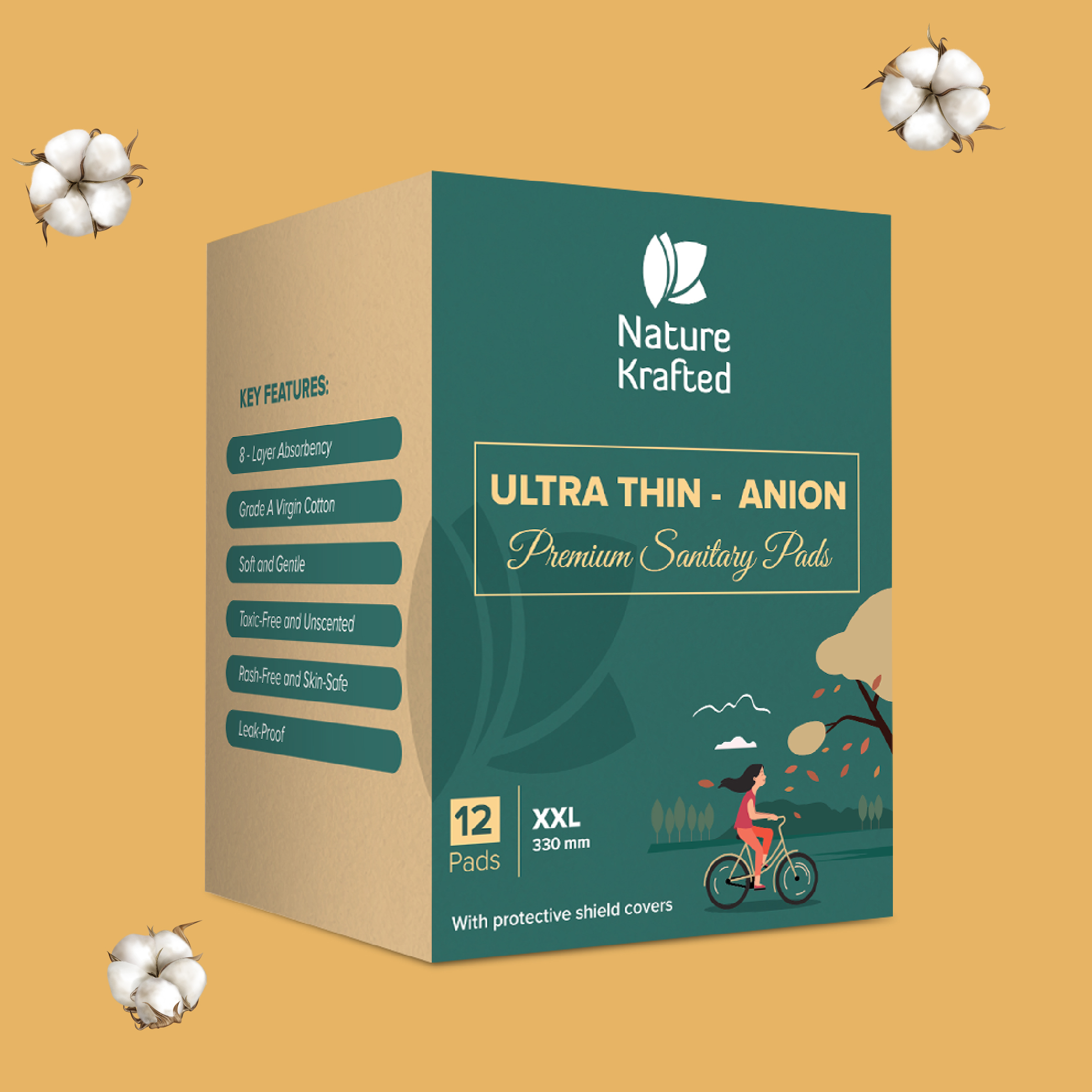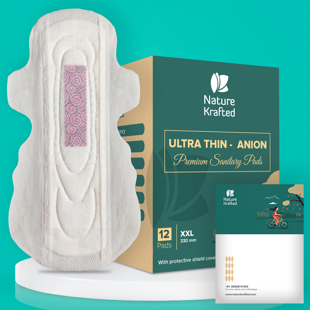 Nature Krafted Anion Sanitary Pads offer feather-like softness and advanced protection. Made with Surgical Grade Virgin cotton, these ultra-thin pads ensure comfort without compromising absorbency. The Anion Strip neutralizes odors, providing a fresh feeling and confidence. With complete leakage protection, natural glue, and a commitment to sustainability, these pads are perfect for an active lifestyle. Choose health and discreet protection with Nature Krafted for every moment of your period.